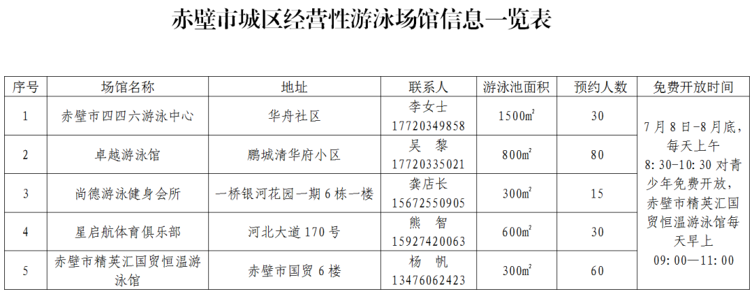为切实维护赤壁青少年暑期游泳安全,引导青少年就近选择规范的游泳场所进行游泳锻炼,现将城区经营性游泳场所以及各乡镇拼装式游泳(嬉水)池暑期对青少年限时免费开放信息予以公告。