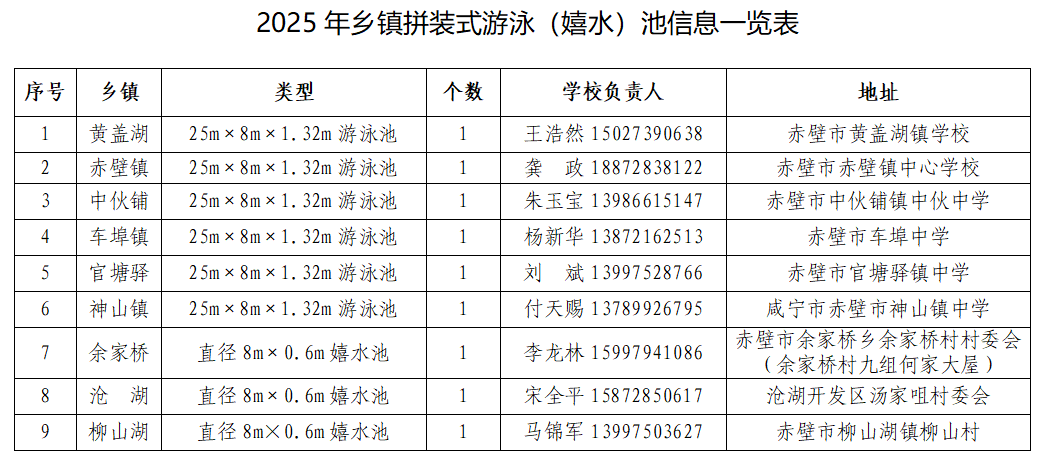 各乡镇拼装式游泳池:2025年7月8日-8月31日,每天下午根据各乡镇实际情况开放。