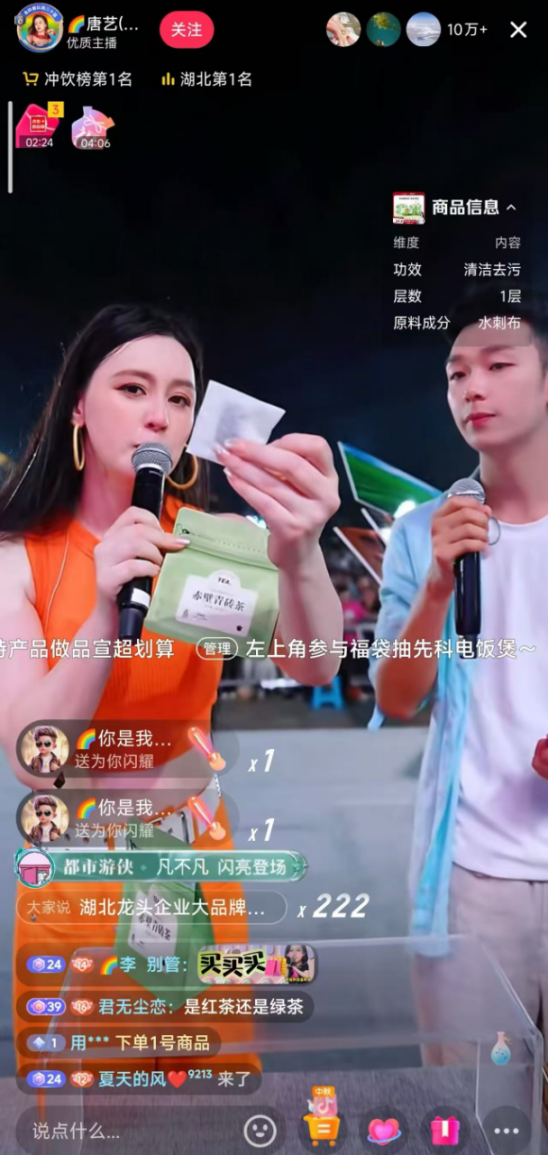 直播当晚,除了精彩的音乐表演,唐艺还与羊楼洞工作人员共同主持“茶文化体验环节”,成为整场直播的高光时刻。“大家看,用沸水冲泡这款赤壁青砖茶,30秒后茶汤就会呈现出琥珀色,橙红透亮,入口先是淡淡的枣香,随后会有明显的回甘。”唐艺一边演示冲泡技巧,一边邀请现场观众和直播间网友“云品鉴”。直播间内,网友纷纷留言互动:“第一次见茶砖还能这么泡,看着就想喝!”“唐艺老师讲解得好细致,已经下单两盒送给爸妈!”据统计,直播期间,单条互动评论峰值超5万条,产品链接点击量突破80万次。她特别提到,羊楼洞青砖茶始于公元682年唐高宗年间,明清时作为中俄万里茶道核心商品风靡欧亚三百年,如今仍是国家地理标志产品与中国重要农业文化遗产。