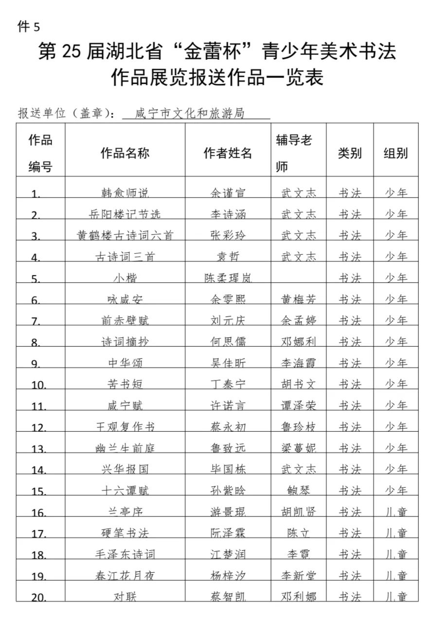 名 称: 咸宁市“金蕾杯"少儿美术书法作品展拟入围名单公示 发布日期: 2025年07月30日