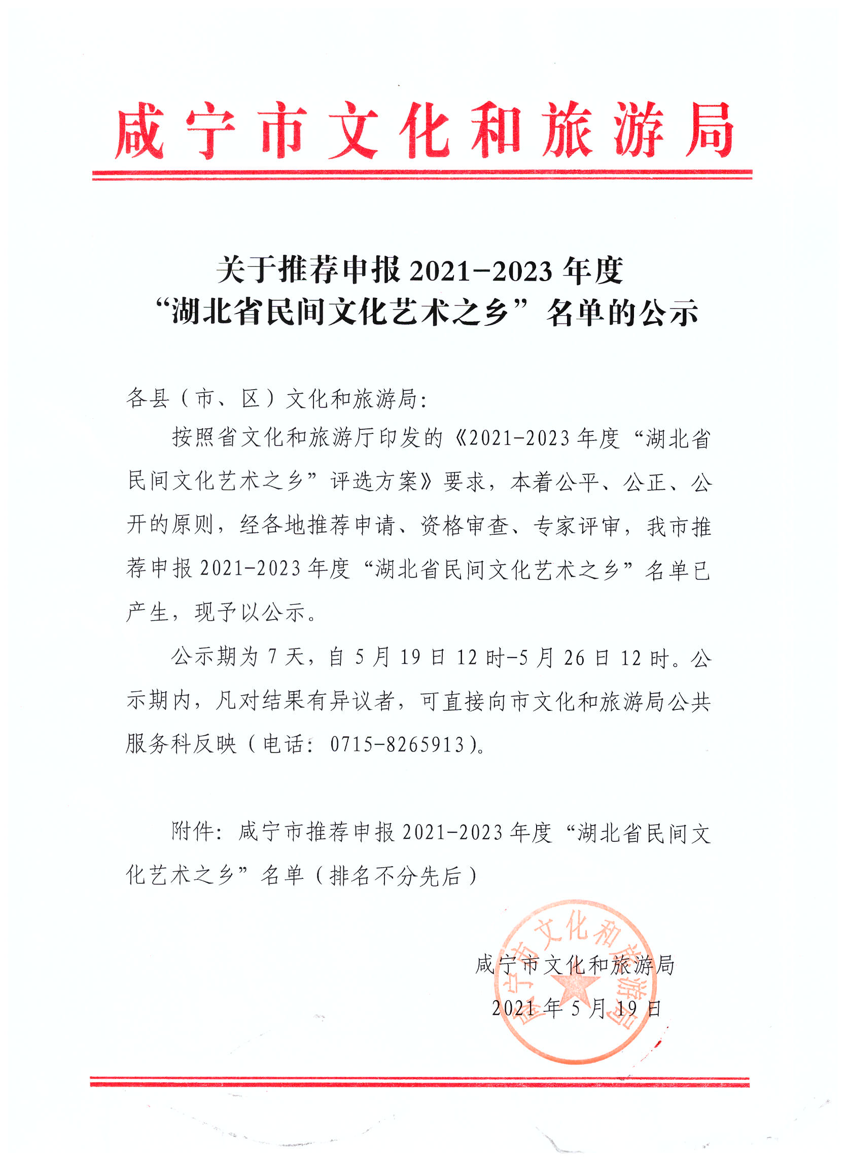 名 称: 关于推荐申报2021—2023年度“湖北省民间文化艺术之乡”名单的公示 发布日期: 2021年05月19日