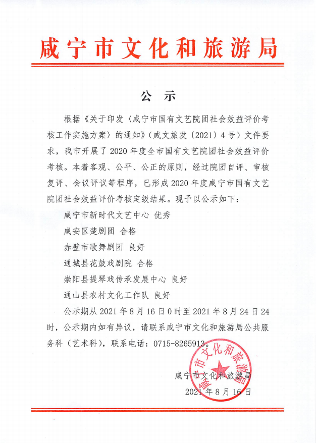名 称: 2020年度咸宁市国有文艺院团社会效益评价考核结果公示 发布日期: 2021年08月16日
