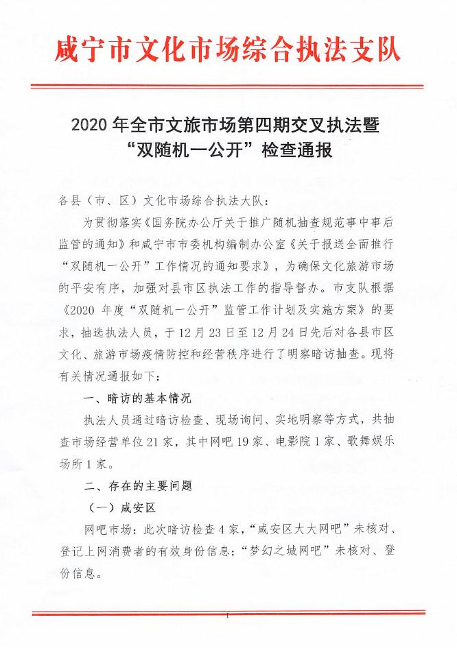 名 称: 2020年全市文旅市场第四期交叉执法暨“双随机、一公开”检查通报 发布日期: 2021年06月09日