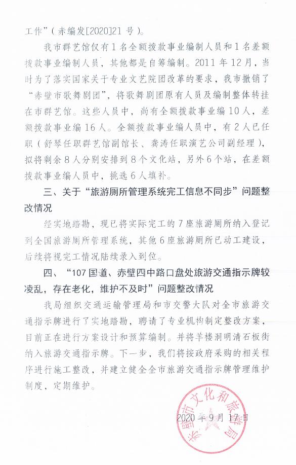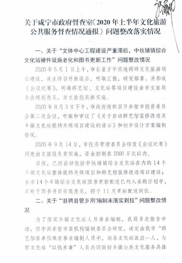 名 称: 赤壁市文化和旅游局关于《2020年上半年全市文化旅游公共服务督查情况通报》整改落实情况 发布日期: 2021年06月09日