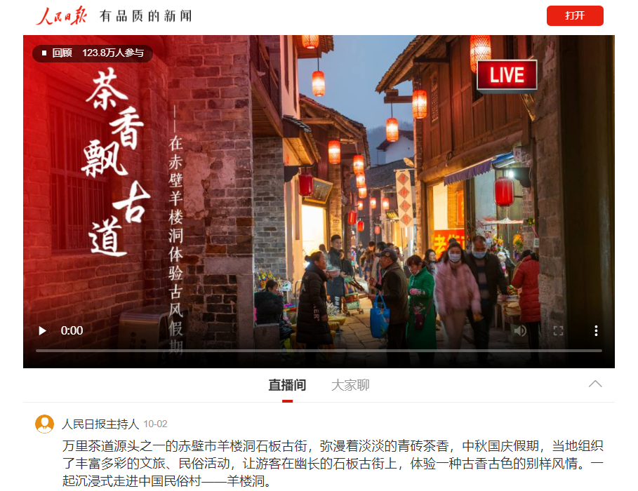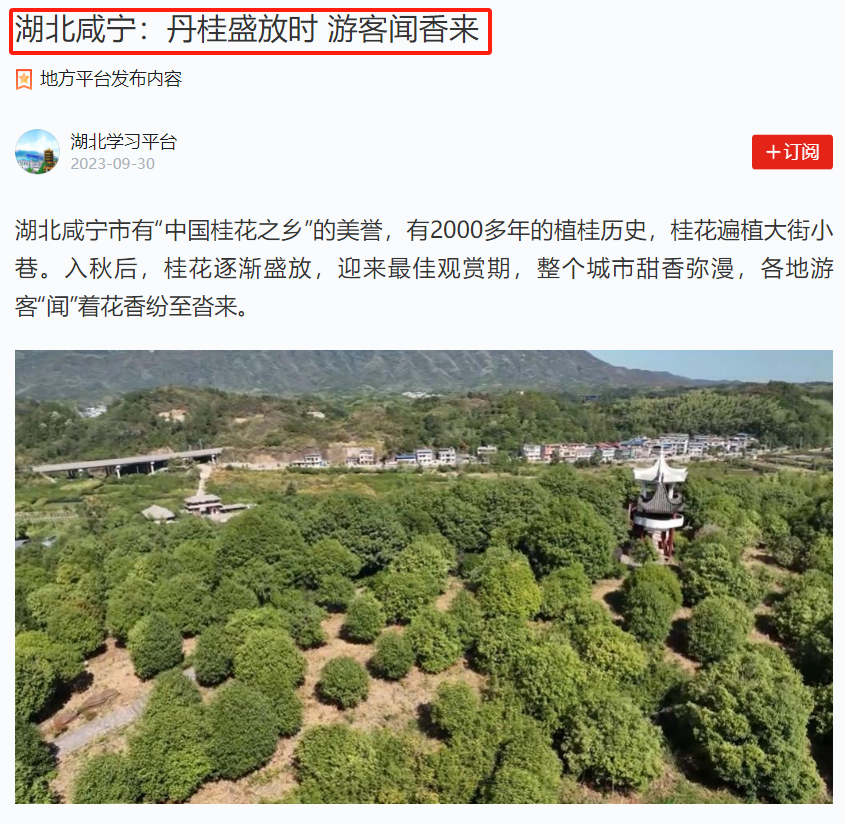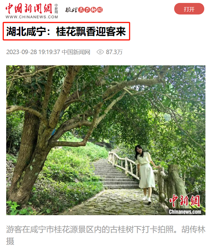 聚力聚集国家、省市媒体宣传咸宁文旅游市场火热状况。假日期间,全网发布咸宁文旅相关图文、视频等精准宣传信息600余篇次,阅读量约超1800万,其中央媒30余篇,省媒60余篇次。央视新闻频道中秋特别策划《明月照家国》播出《寻景中秋 山河锦绣 湖北咸宁:桂华秋皎洁 中秋正芬芳》、人民网和学习强国发布《湖北咸宁:传承两百年 祭月庆中秋》、学习强国发布《湖北咸宁:丹桂盛放时 游客闻香来》、CCTV4中国舆论场推发《中国式现代化,百闻不如一见(咸宁篇)》等信息,中国新闻网发布《湖北咸宁:桂花飘香迎客来》,阅读量超87.3万,对咸宁桂花及祭月文化颇为关注。10月6日晚,CCTV-13《新闻直播间》播出《湖北 夜游羊楼洞 解锁沉浸式茶乡穿越之旅》。咸宁日报人民号直播《茶香飘古道-在赤壁羊楼洞体验古风假期》阅读量超120万。湖北卫视《湖北新闻》播出关注赤壁市“月夜羊楼 好市发生”灯光夜游活动、咸宁桂子古风奇妙夜活动、香城滑雪馆及赤壁猕猴桃采摘等活动及业态。湖北广播电视台播出《直通咸宁》专题节目,持续关注咸宁大学生文旅推介人活动、羊楼洞、桂花等信息。大学生文旅推介人的咸宁游记陆续推出,逐渐在年轻群体内形成聚合宣传效果。
