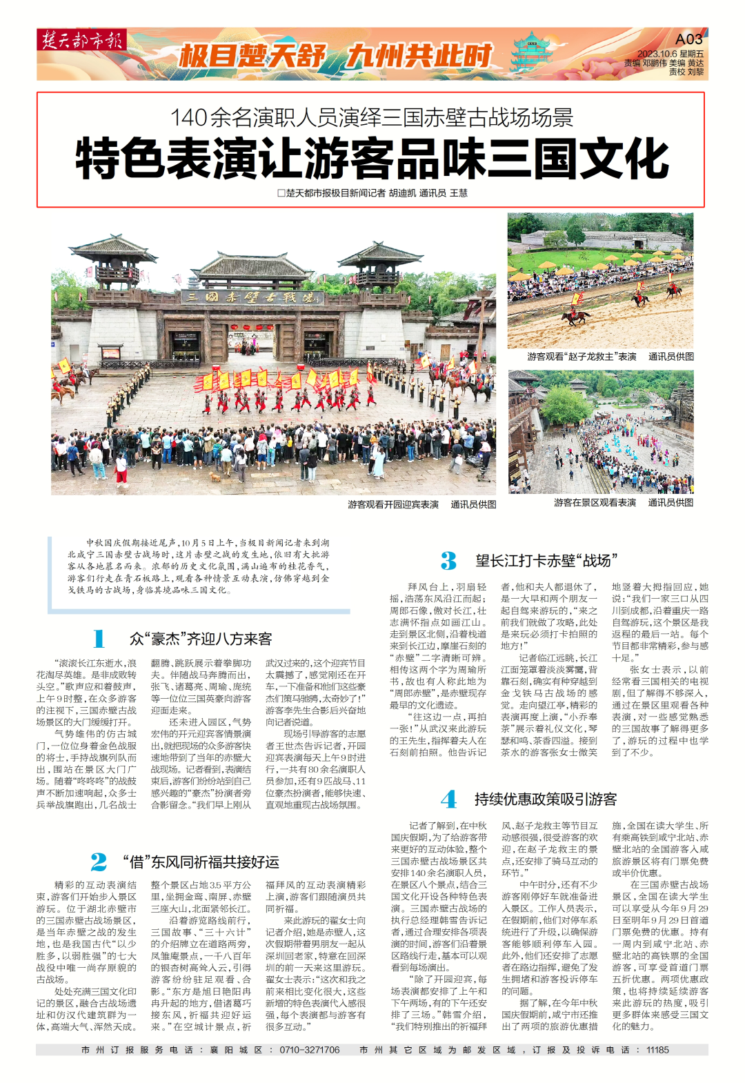 各大旅游景区竞相创新,推出系列沉浸式互动体验活动。三国赤壁古战场《借东风行好运》主题互动表演火热开场。松鼠部落2023武汉首届动物菊花艺术展、萝卜公社大型奇幻灯光秀、科学魔法秀、万国来朝情景演出精彩上演。碧桂园凤凰温泉酒店“遇见桂花 十一温泉亲子之旅”以桂为媒增进亲子关系。药姑山·古瑶村推出“古瑶向阳·亲子旅途”国庆礼包,带游客制作手工月饼、画扇、投壶掷箭,于欢乐祥和中尽享假日时光。际华冰雪·香城滑雪馆开展亲子冰雪娱乐、雪地音乐节、冰雪女王巡游记、国庆八天乐等主题活动,累计接待游客超1.5万人次。三是文旅融合激发新活力。假日期间,各色文化展演、民俗活动集中开展,全市累计开展各类文旅活动85场,文化气息浓厚。咸安区桂花镇大屋雷中秋祭月活动盛大举办,传承两百年的古老民俗历久弥新。市人民广场上,“文化力量 民间精彩”咸宁市第七届群众广场舞比赛、“大地欢歌”咸宁市2023年地方文艺调演、咸宁市2023年迎国庆文化惠民演出等活动陆续开展。“荆楚购·宁惠购”咸宁特色品牌推介会暨商文旅融合展销活动赤壁北街社区网红桥桥头,“情暖中秋乐团圆 ·喜迎国庆谱华章”赤壁市文联“红色文艺轻骑兵”创建文明城市宣传进社区“强国复兴有我·欢庆我们的节日”文艺展演火热开幕;市图书馆里,“月满中秋 情满咸图”快乐阅读系列活动书香四溢;市博物馆内,我们的节日·中秋节非遗掐丝珐琅镜制作活动温馨开办,在非遗传承中共庆佳节,弘扬中华优秀传统文化,为美丽假日平添文化趣味。“情暖中秋乐团圆 ·喜迎国庆谱华章”赤壁市文联“红色文艺轻骑兵”创建文明城市宣传进社区“强国复兴有我·欢庆我们的节日”文艺展演